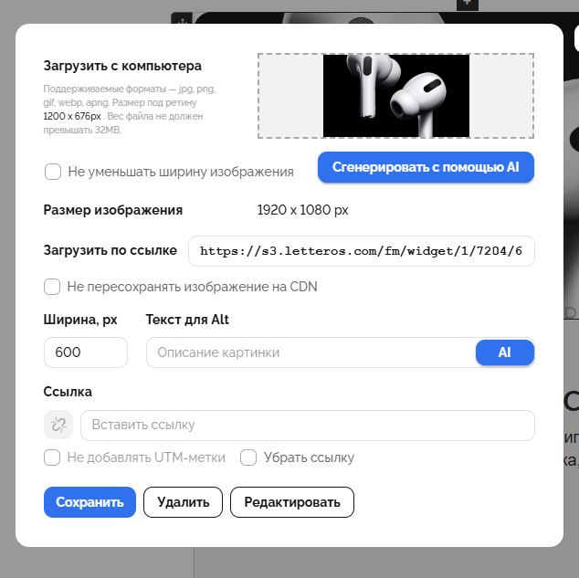 • В поле «Ссылка» можно указать адрес страницы товара, чтобы при клике пользователь переходил на сайт.