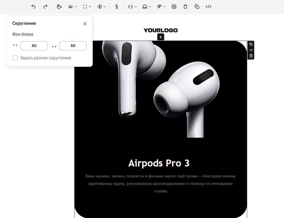• Установите значение 50 — получится аккуратный визуальный блок‑карточка.