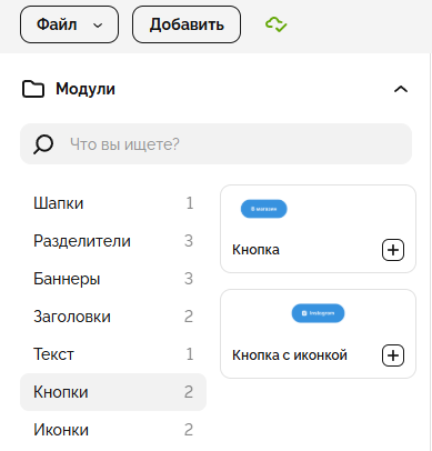 • Перейдите в раздел «Кнопки» → выберите «Кнопка» и перетащите её под баннер.
