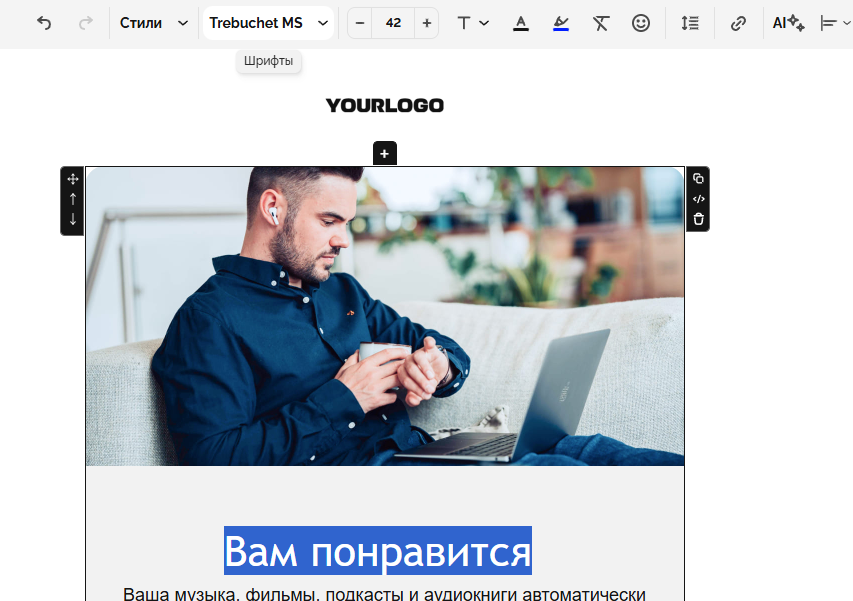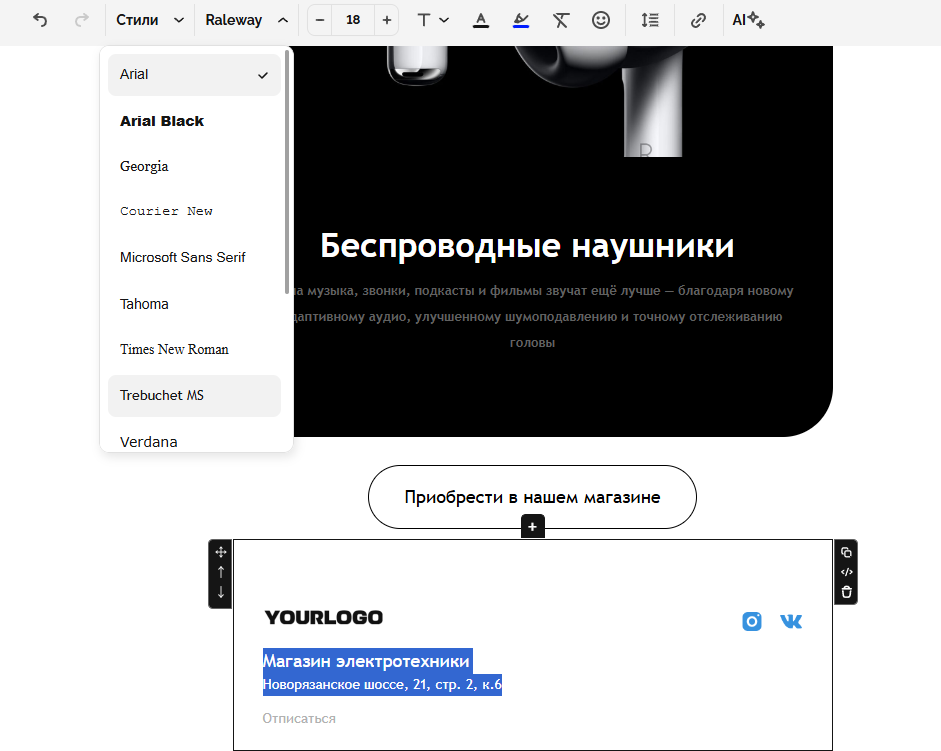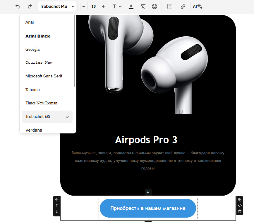 • По умолчанию для писем чаще всего используется Arial — он универсален и корректно отображается в большинстве почтовых клиентов. Однако в нашем примере мы будем использовать Trebuchet MS.