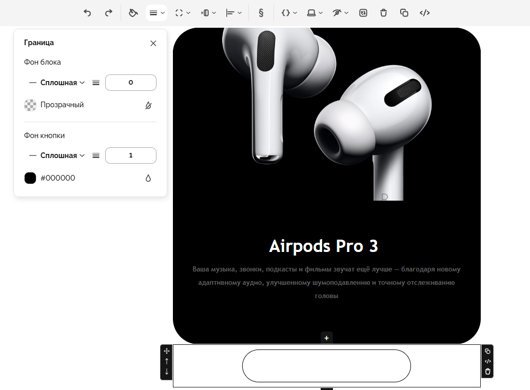 • Добавьте небольшой отступ между кнопкой и подвалом: наведите курсор на верхнюю границу блока и увеличьте расстояние.