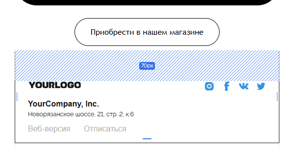 Футер — обязательная часть любого письма. В нём обычно размещаются контакты, ссылки на социальные сети и кнопка отписки. Добавим его, чтобы завершить письмо и придать ему законченный вид.