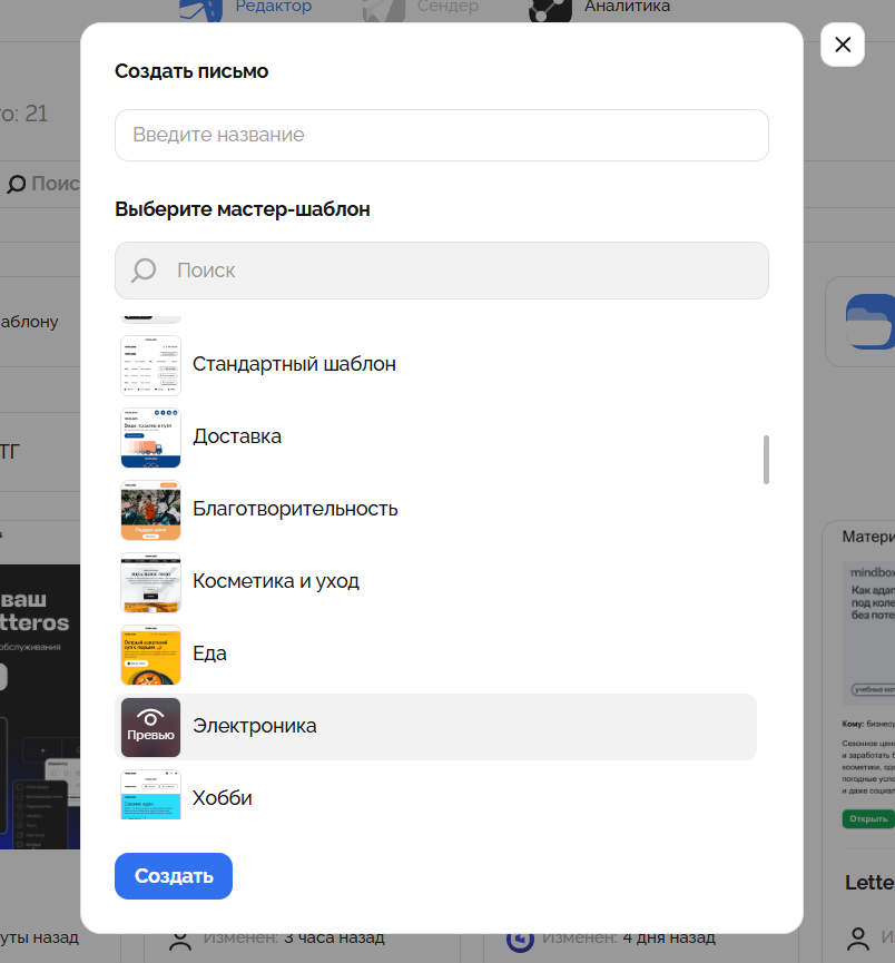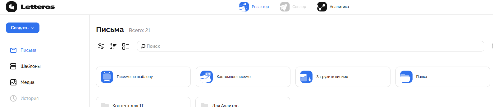 Здесь находится раздел, где отображаются все созданные письма. Над списком расположены кнопки быстрого создания рядом со строкой поиска, а также основная кнопка «Создать». С её помощью можно начать новое письмо или выбрать подходящий вариант из доступных шаблонов.
