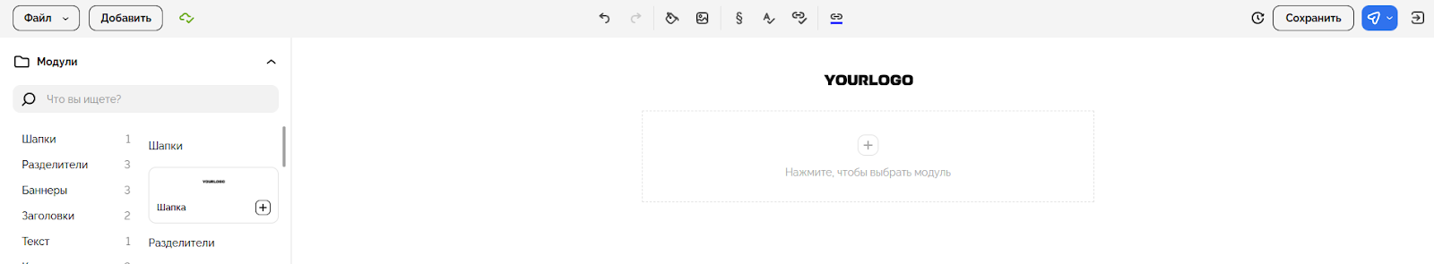 Итак, перед нами пустой холст — основа вашего будущего письма. Сейчас мы шаг за шагом наполняем его контентом: добавим логотип, баннер с описанием, кнопку перехода и оформим всё в едином стиле.