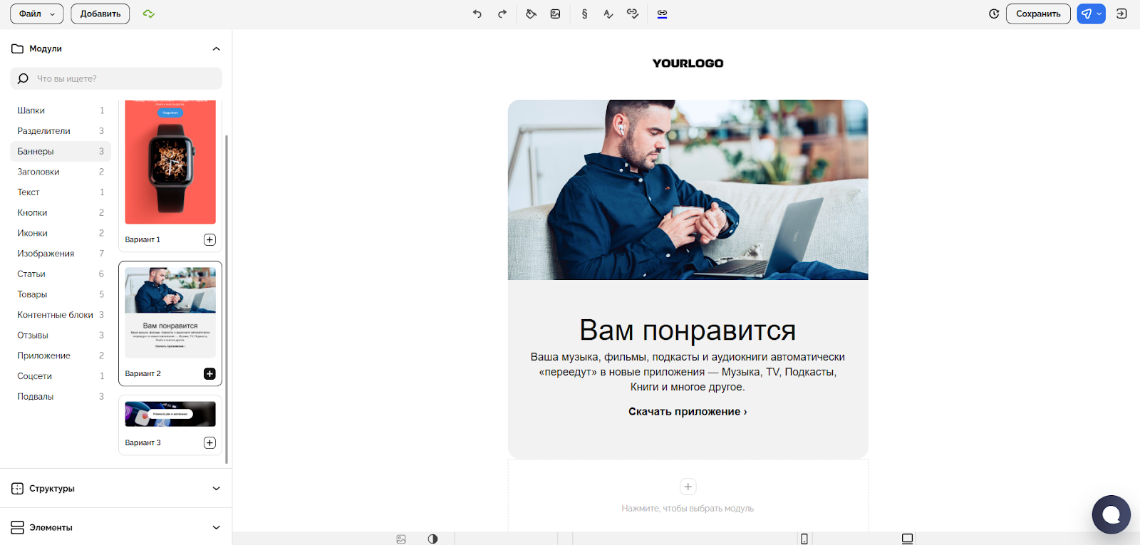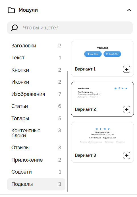 • Перейдите в раздел «Подвалы» и выберите вариант 2 — он подойдёт для стандартных промо‑писем.