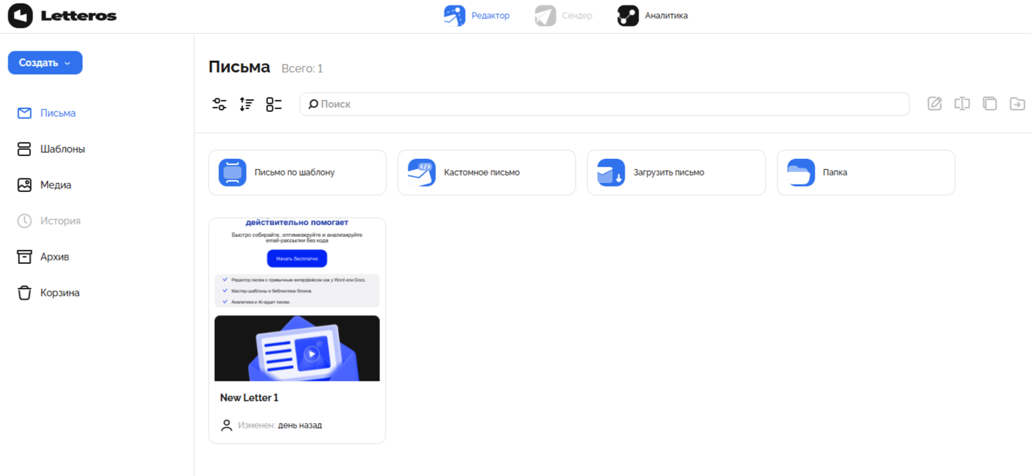 После регистрации и выбора тарифа можно приступить к созданию первого письма. В Letteros это делается просто — без верстки и сложных настроек.
