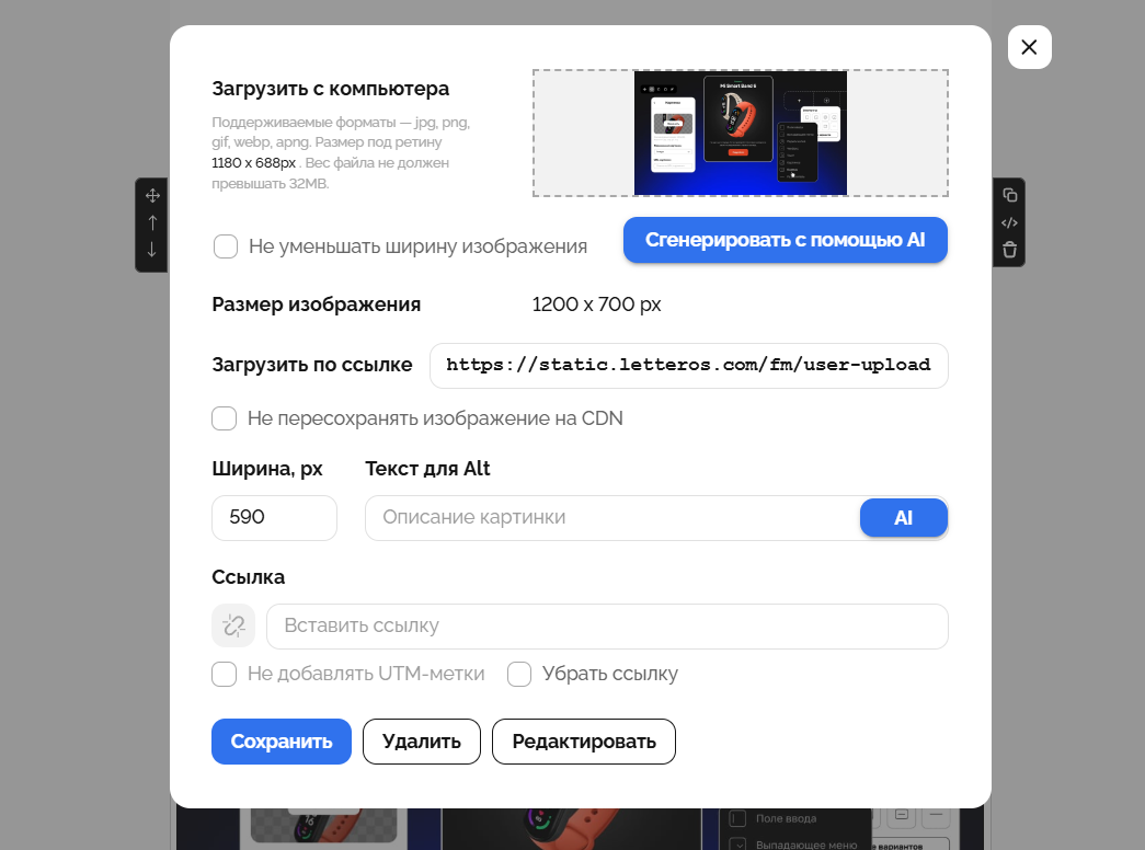 Если изображение вставляется по ссылке, можно выбрать опцию «Не пересохранять изображение на CDN», чтобы использовать оригинальный источник.