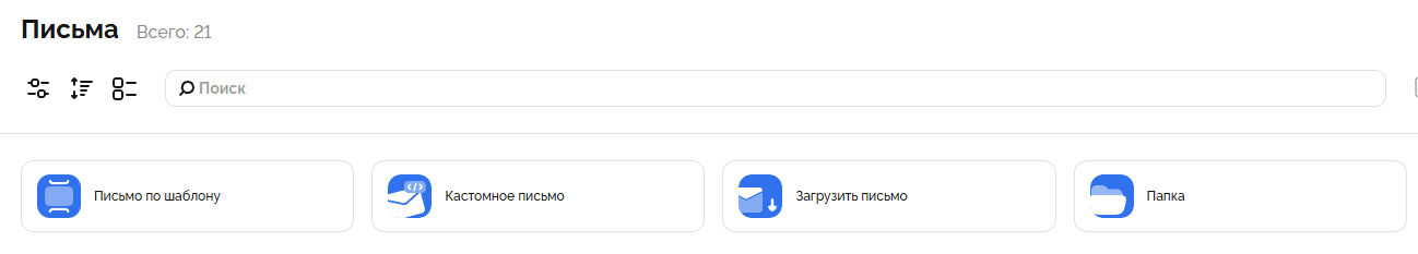 На страницах «Письма», «Шаблоны» и «Медиа» доступны кнопки создания прямо над списком — рядом со строкой поиска. Здесь можно отфильтровать, отсортировать и создать новый элемент без необходимости нажимать кнопку «Создать».
