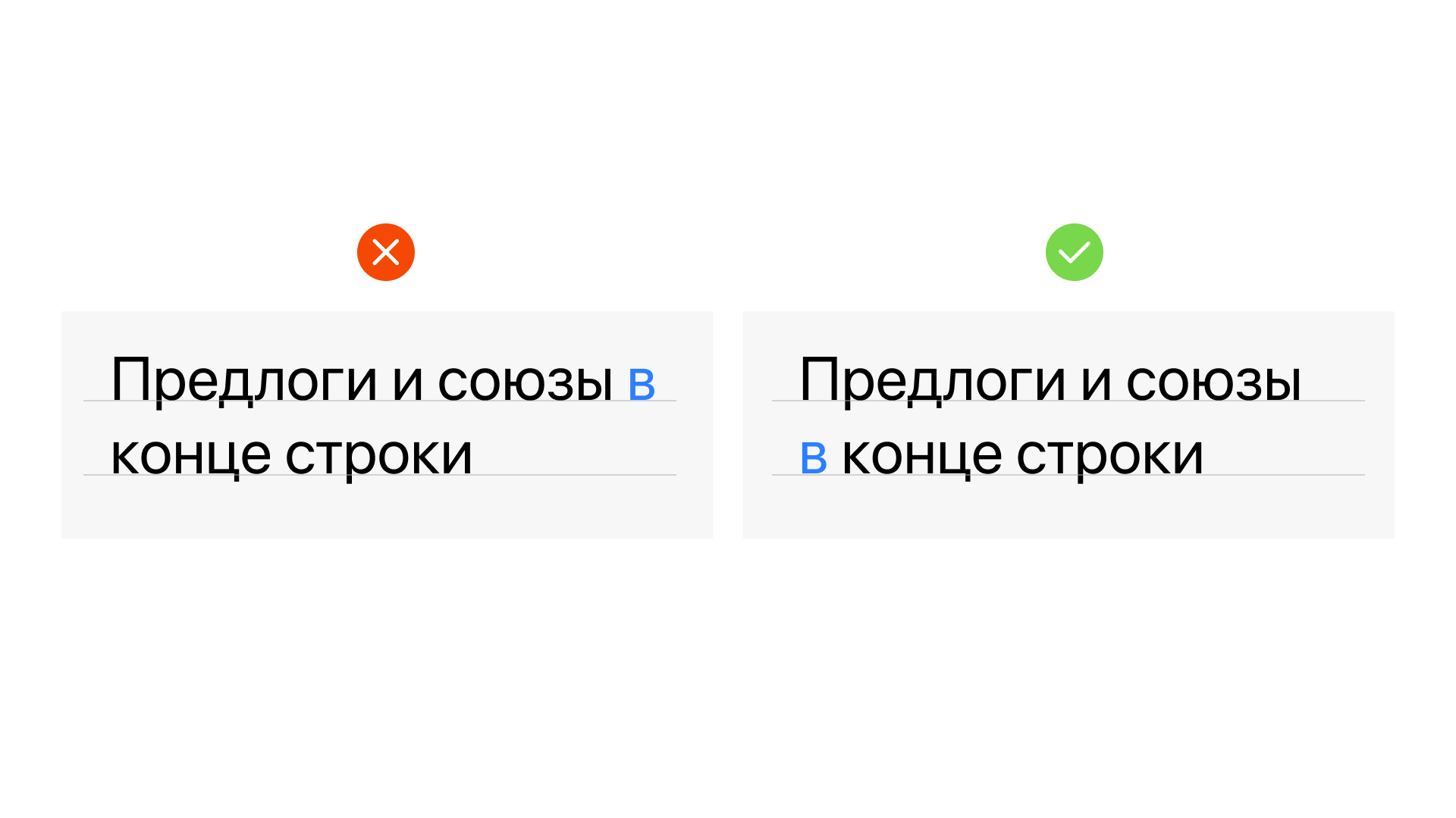 Висячие предлоги. Не оставляйте предлоги и союзы в конце строки. Они неразрывно связаны со следующим словом, а перенос заставляет читателя делать ненужную паузу.