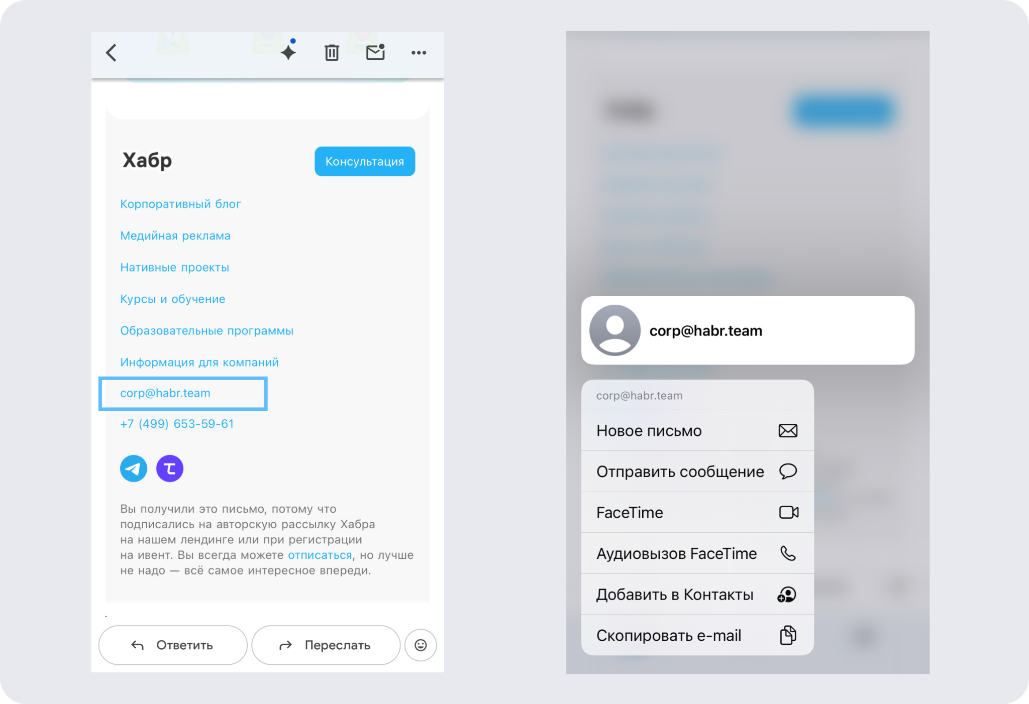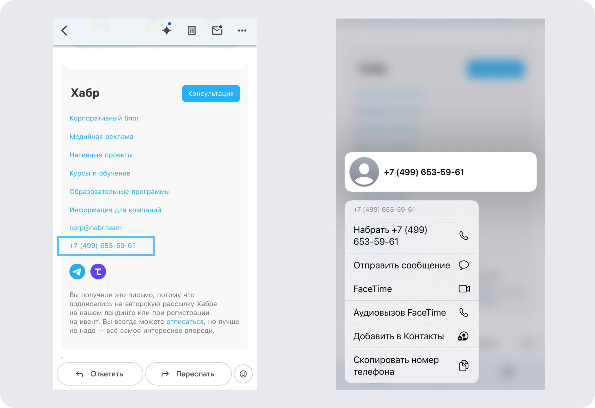 Телефон и email в виде обычного текста в письме — лишний шаг для читателя. На мобильном нужно скопировать номер, открыть приложение звонков и набрать цифры вручную. Большинство пользователей этого не делают.