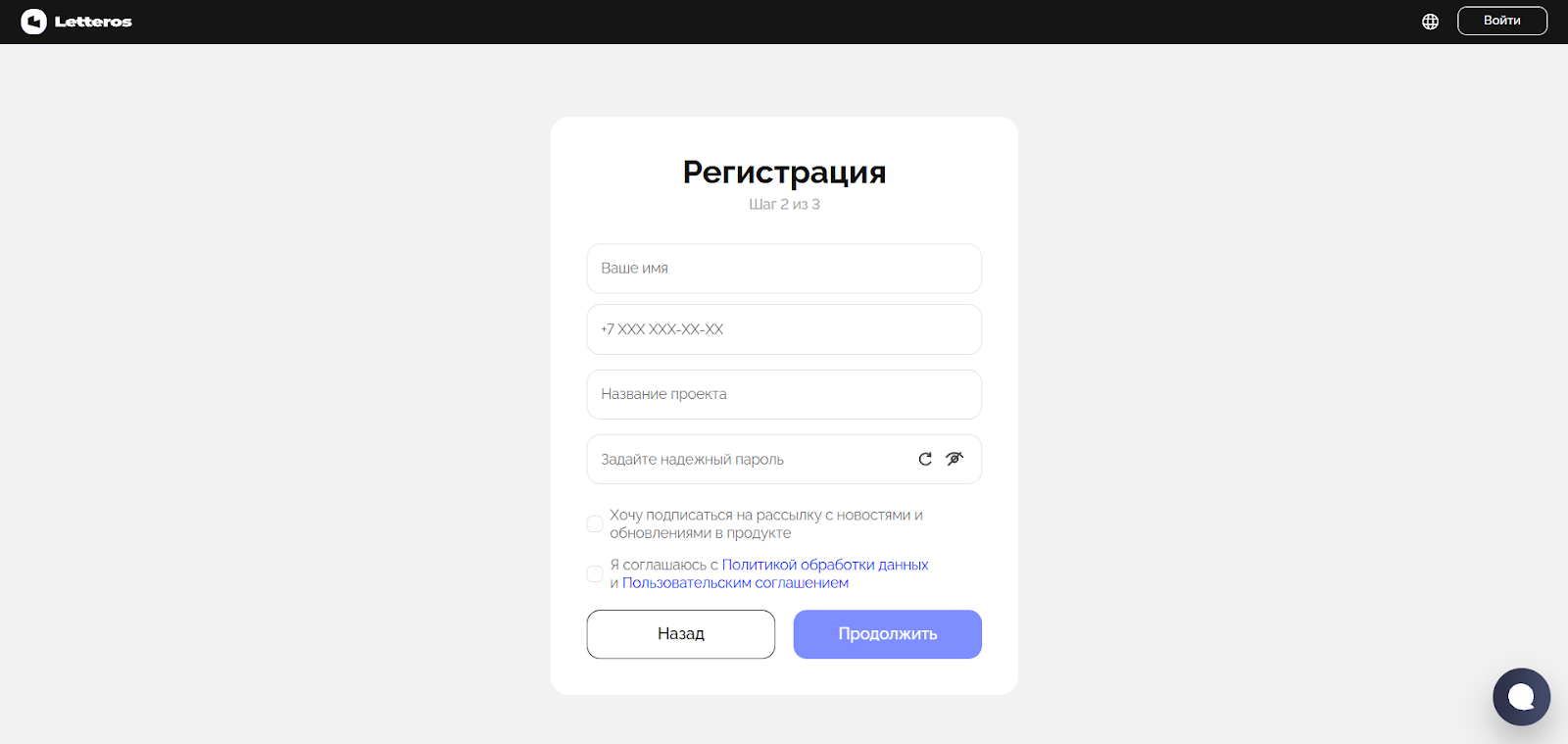 3. Заполните форму: укажите своё имя, номер телефона, название проекта и придумайте надёжный пароль. Обязательно поставьте галочку о согласии с Правилами использования и Политикой конфиденциальности.