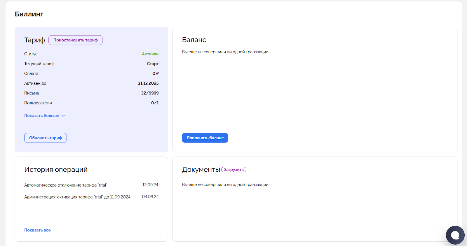 • Тариф — показывает текущий план, статус (активен / приостановлен), дату действия и лимиты по письмам и пользователям.