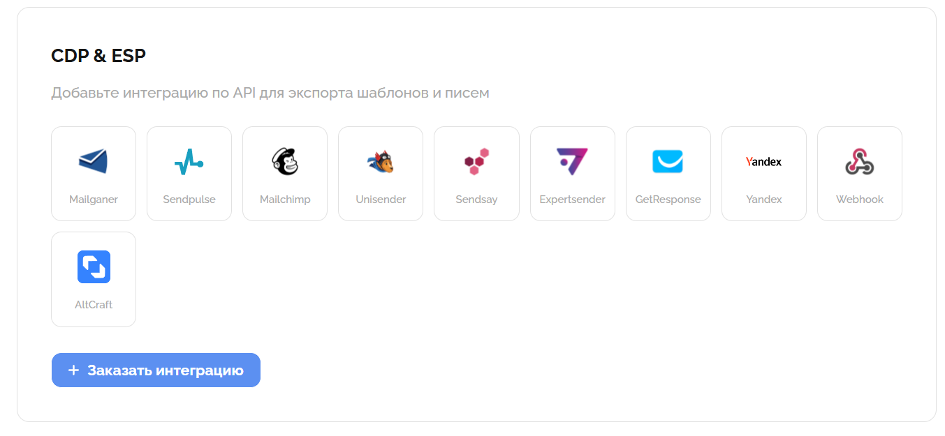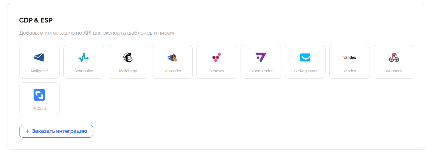 Если вы не нашли свой ESP или CDP среди доступных интеграций, в блоке CDP & ESP доступна кнопка «Заказать интеграцию».