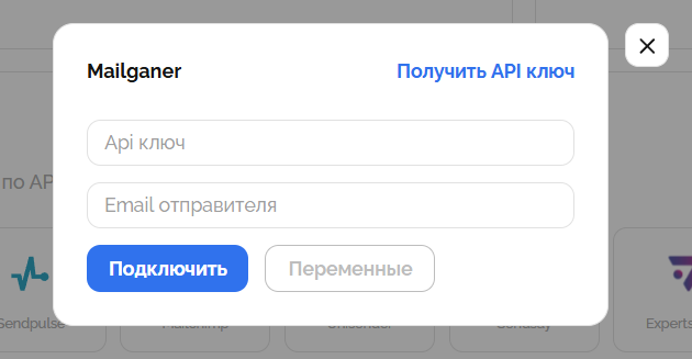 • API ключ — его можно получить по ссылке «Получить API ключ» в правом верхнем углу окна или в личном кабинете Mailganer.
