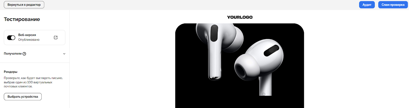В разделе «Тестирование» вы можете проверить, как письмо будет отображаться в разных почтовых клиентах, на платформах и устройствах. Это помогает заранее увидеть возможные отличия рендеринга — например, в Outlook, Gmail или мобильных приложениях.