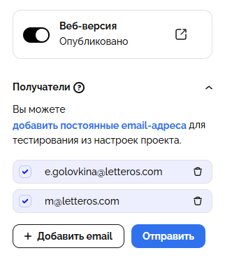 3. Ниже расположен блок «Получатели» — здесь можно указать email-адреса, на которые отправится тестовое письмо. Вы можете добавить постоянных получателей для тестирования, они подгружаются автоматически из настроек проекта.