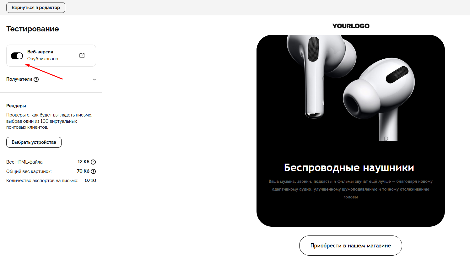 Веб‑версия позволяет открыть письмо как отдельную веб‑страницу. Это удобный способ показать письмо коллегам или согласовать дизайн без отправки тестового письма.