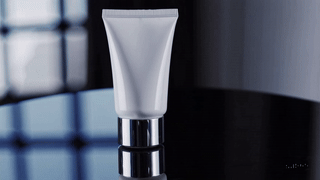 A sleek, white cosmetic cream tube slowly rotates on a polished, obsidian-black surface that reflects the soft, ambient glow of a distant, out-of-focus window. Gentle, almost imperceptible steam or mist subtly rises from around the base of the tube, catching the light. The reflection of the tube is perfectly mirrored on the wet-look surface. Soft, cinematic lighting creates dramatic yet elegant highlights and shadows. A very subtle, slow-motion effect on the rotation. Shallow depth of field, 8k, hyper-realistic, high-detail, commercial product photography, film grain.