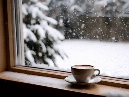 Вид из окна на заснеженный сад, на подоконнике стоит чашка горячего кофе. За стеклом густыми хлопьями медленно и бесшумно падает пушистый снег. Атмосфера хюгге, мягкий фокус, высокая детализация.