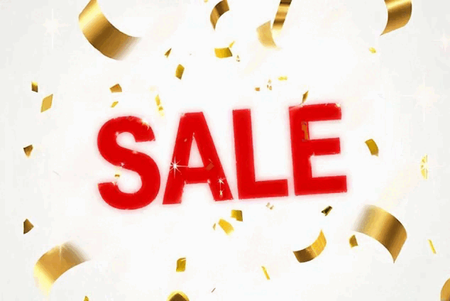Анимированный баннер: на белом фоне ярко‑красная надпись «SALE» пульсирует и светится. Вокруг разлетаются золотые конфетти и искры. Высокое разрешение, яркие цвета, динамично.