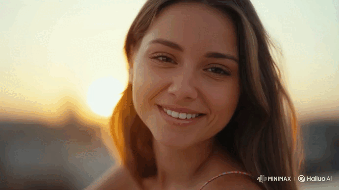A close-up portrait of a young woman laughing naturally. Her hair is blowing slightly in the wind, hyper-realistic skin texture, visible pores and eyelashes. High frame rate, smooth 60fps motion, soft sunset lighting, bokeh background, commercial fashion style.