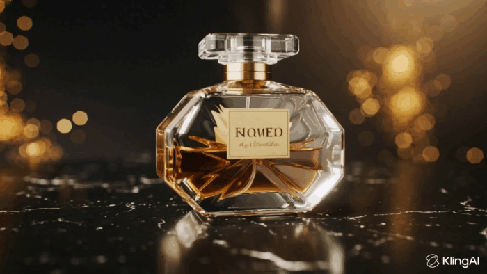 High-end commercial video, 360-degree camera orbit around a luxury perfume bottle, standing on black reflective marble. Golden sunlight flares, floating dust motes in bokeh background, cinematic studio lighting, hyper-realistic glass and liquid textures, 4k, smooth motion.
