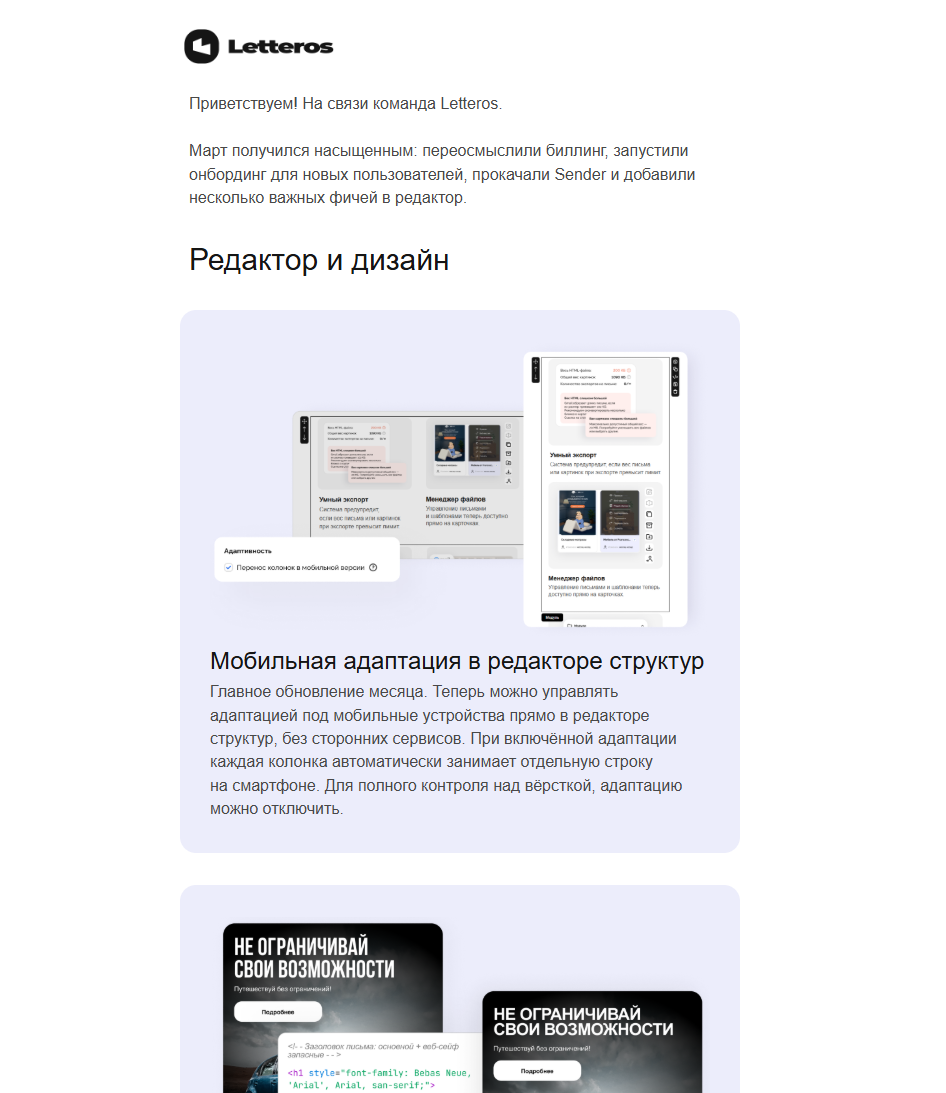 Письмо разделено на темы: «Редактор и дизайн», «Функциональность» и «Обновления платформы». Так читатель не тратит время на лишнее и сразу переходит к важным для него новостям. Каждое обновление мы подаем через реальную пользу. Мы не просто пишем про технические правки, а объясняем: теперь управлять адаптацией писем можно прямо в редакторе без помощи сторонних сервисов. В деловых коммуникациях такой язык ценится выше всего, так как он экономит ресурсы заказчика.