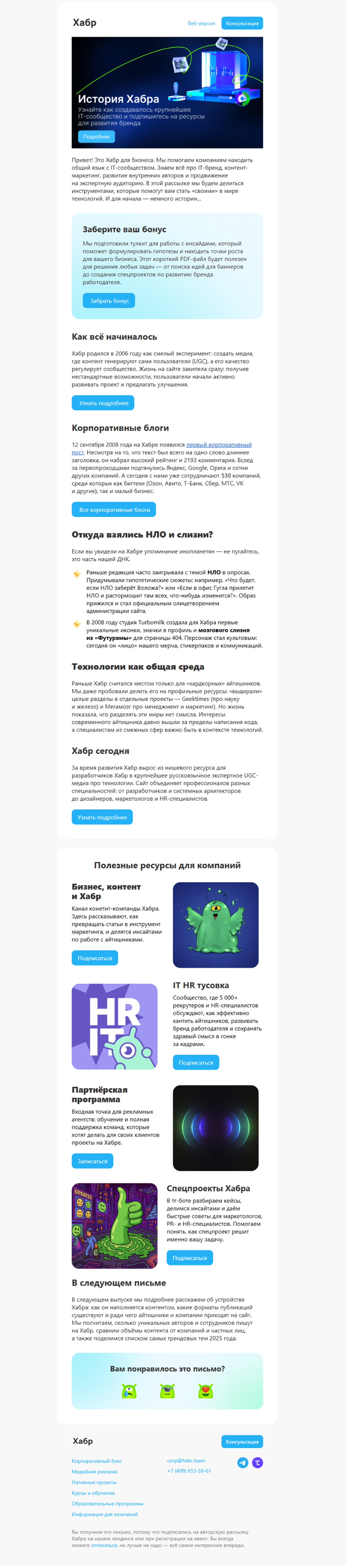Рассылка Хабра для бизнес‑партнеров. Компания не продает услуги «в лоб», а делится историей площадки, кейсами и полезными ссылками для HR-отделов. Это формирует образ экспертной среды, в которой бизнес‑клиент хочет присутствовать.