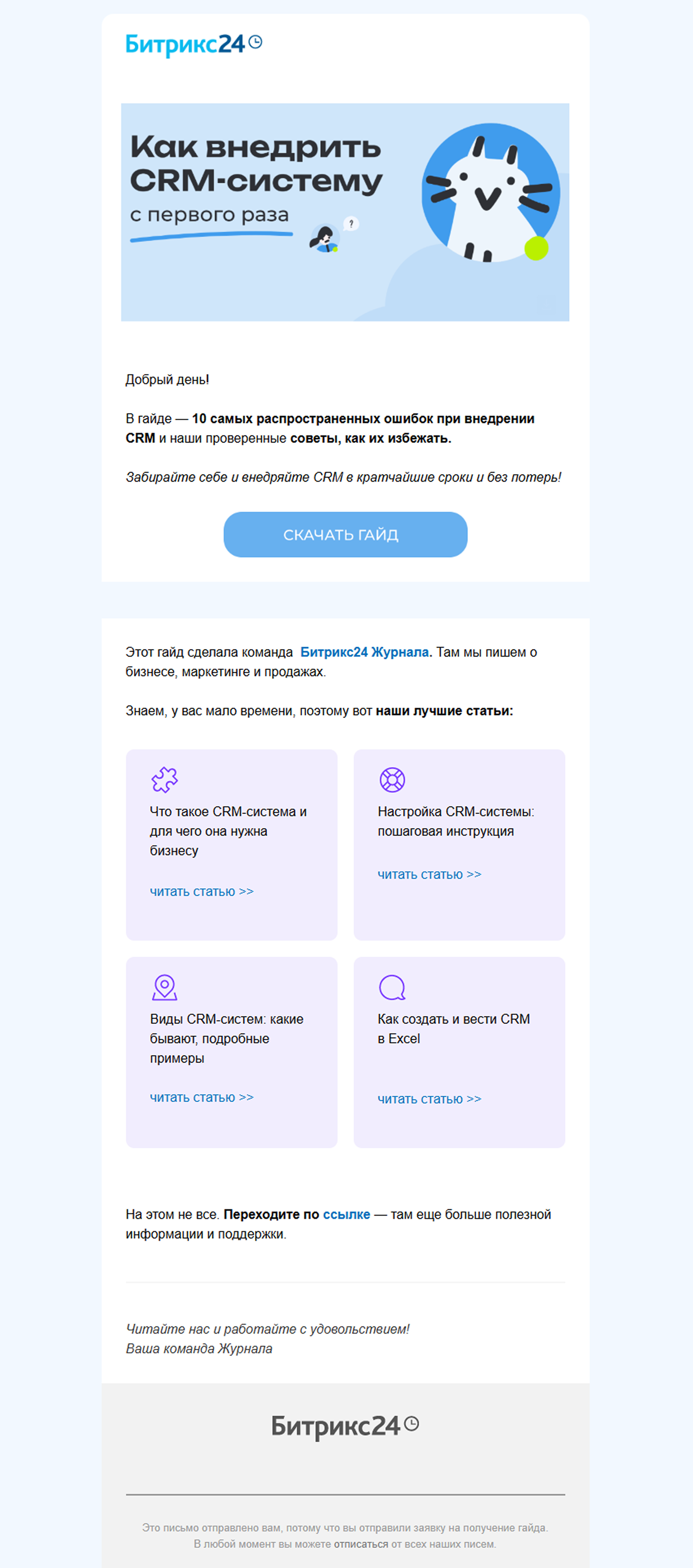 Рассылка «Битрикс24» с гайдом по внедрению. Четкое обещание пользы в заголовке, минимальное описание и заметная кнопка для скачивания на первом экране. Такое письмо решает острую проблему клиента и подтверждает экспертизу сервиса.