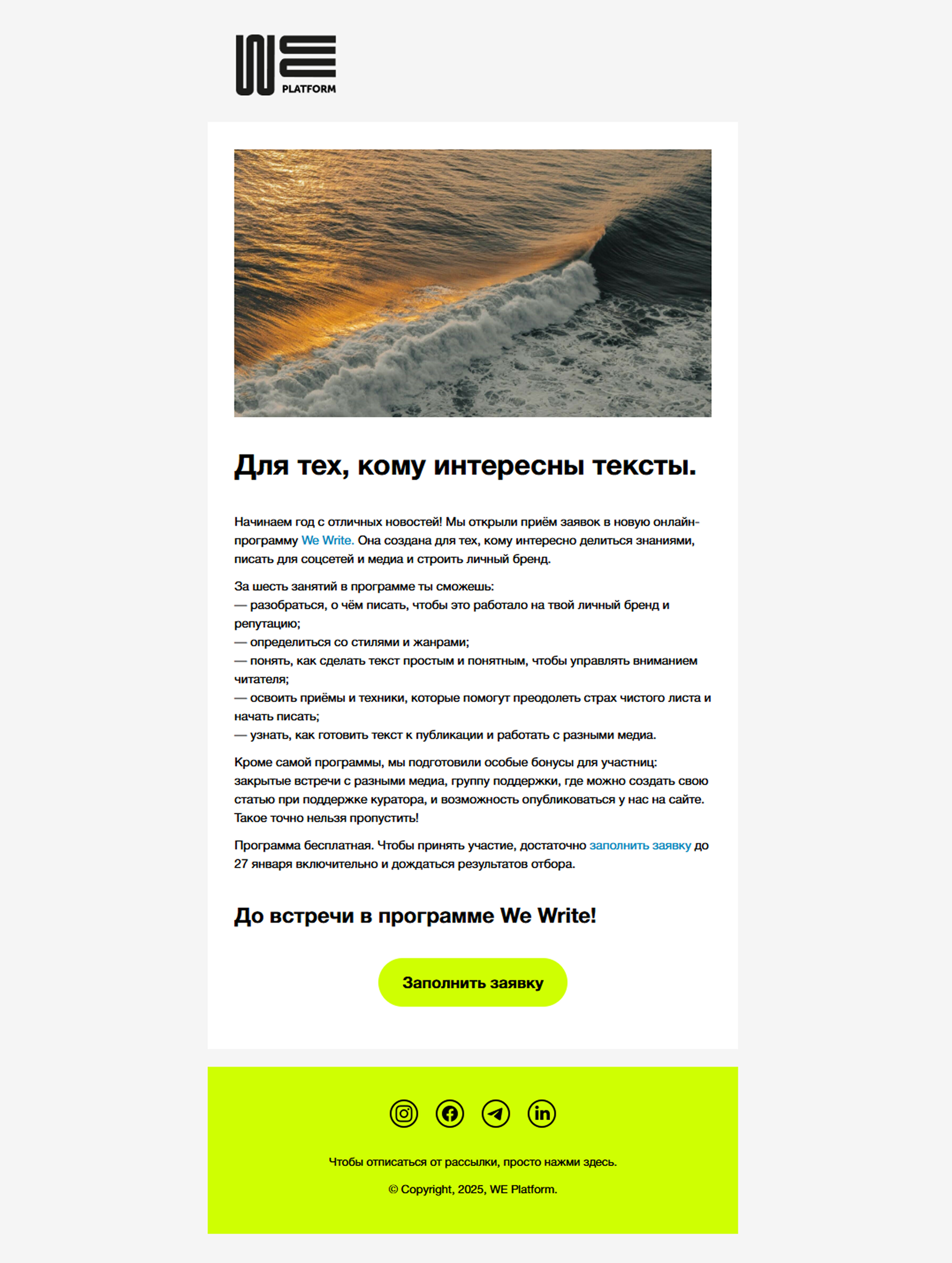 Письмо от WE Platform. Вместо саморекламы — список навыков, которые даст обучение. В тексте есть четкие сроки и понятный призыв к действию. Это важно для бизнес‑аудитории, которая ценит время и конкретику.